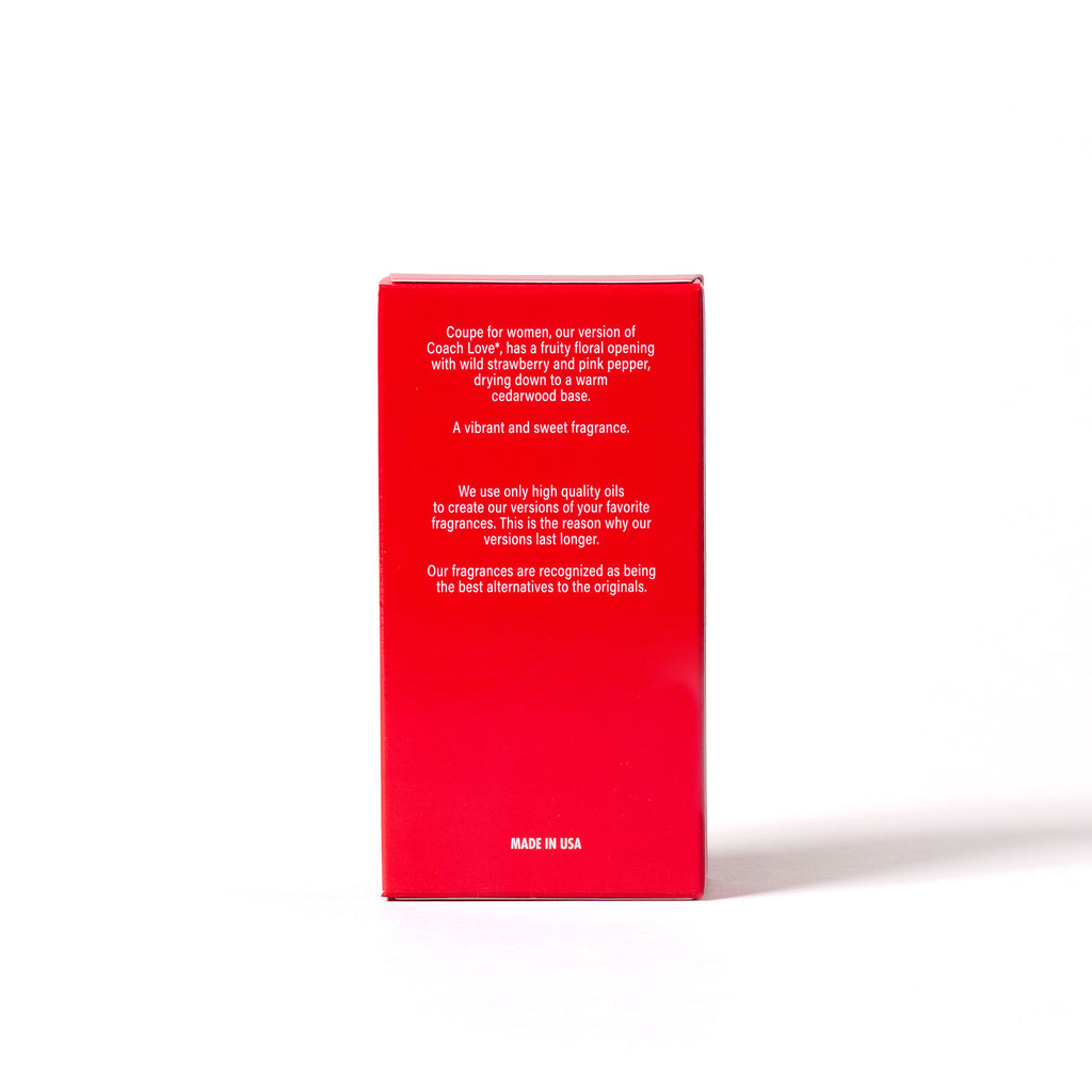 Coupe for women, our version of Coach Love* eau de parfum, has a fruity floral opening with wild strawberry and pink pepper, drying down to a warm cedarwood base.