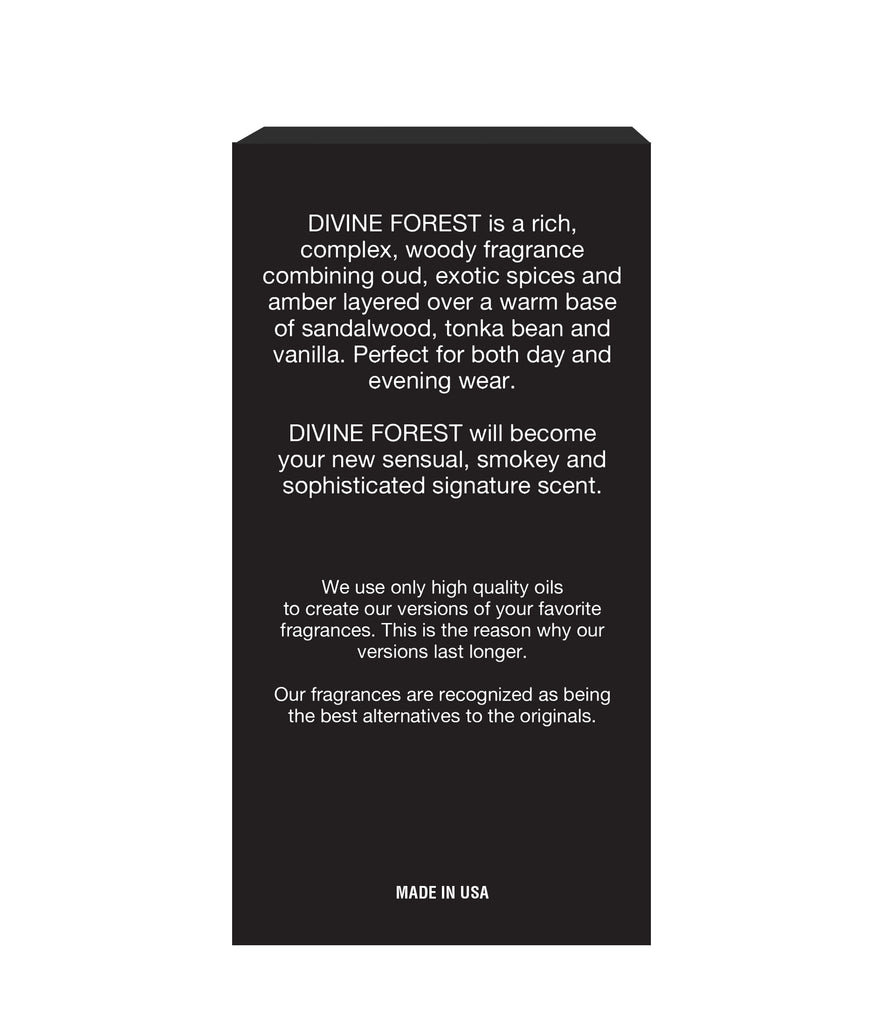 Divine Forest is a rich, complex, woody fragrance combining oud, exotic spices and amber layered over a warm base of sandalwood, tonka bean and vanilla. Perfect for both day and evening wear. Divine Forest will become your new sensual, smokey and sophisticated signature scent.